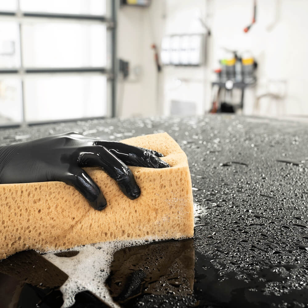 - aplică o cantitate generoasă de spumă pe suprafață, apoi spală cu un burete (puteți utiliza o perie sau o masnușă de spălare).