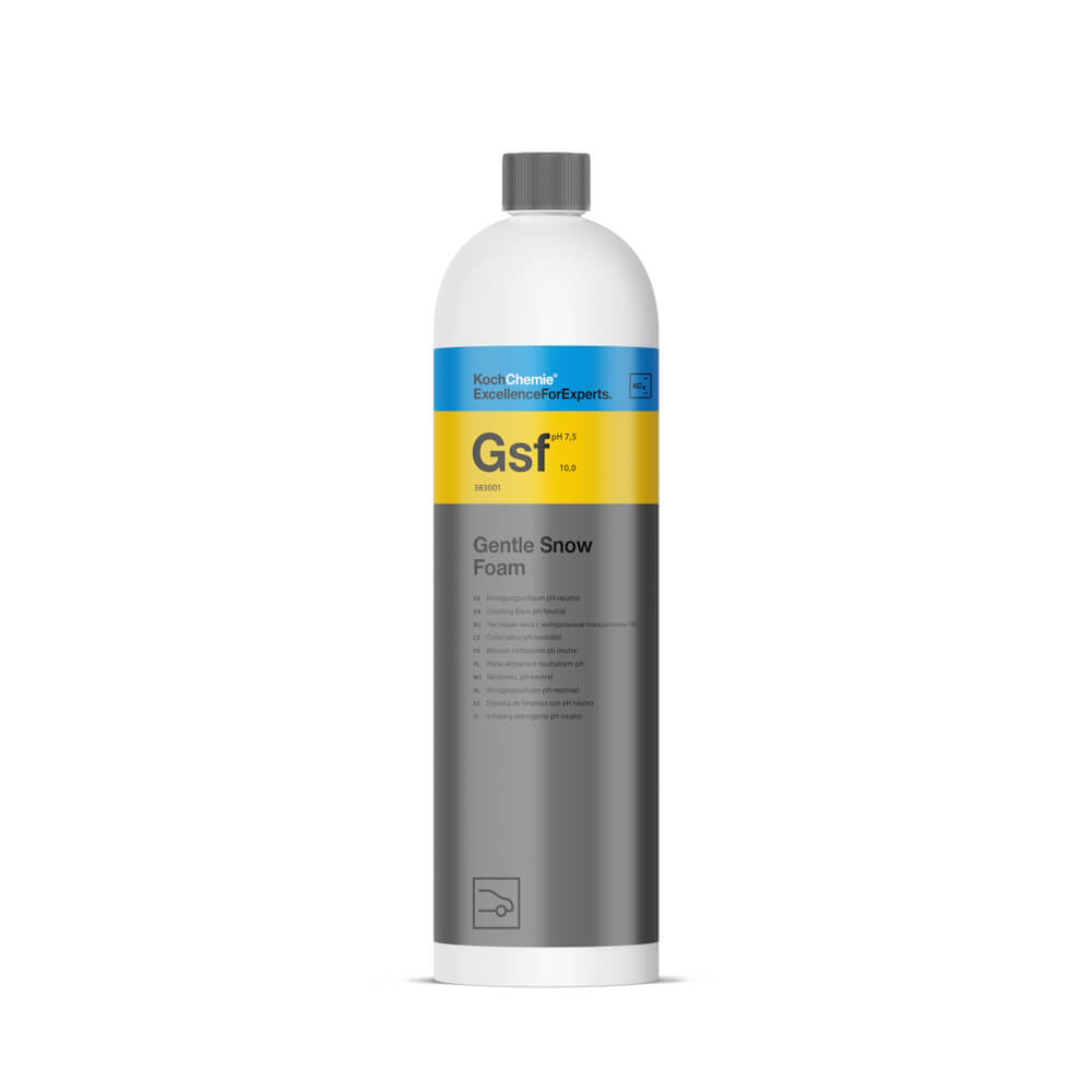 Koch Chemie Gentle Snow Foam Gsf este un produs cu spumare intensă și pH neutru cu o aromă unică de cireșe, care poate fi utilizat ca și spumă pentru prespălare atunci când este aplicat cu pistol de spumă sau cu un nebulizator spumant sau ca șampon pentru spălarea manuală a autovehiculelor. Gentle Foam Snow formează un strat uniform și umed, care se lipește de întreaga suprafață, oferind astfel un timp lung de aplicare. Datorită formulei cu pH neutru, nu corodează suprafețele ceruite sau tratate cu sealant. Gentle Foam Snow poate fi îmbogățit cu Green Star pentru a crea o spumă activă, pentru îndepărtarea cu ușurință a insectelor sau a murdăriei persistente.