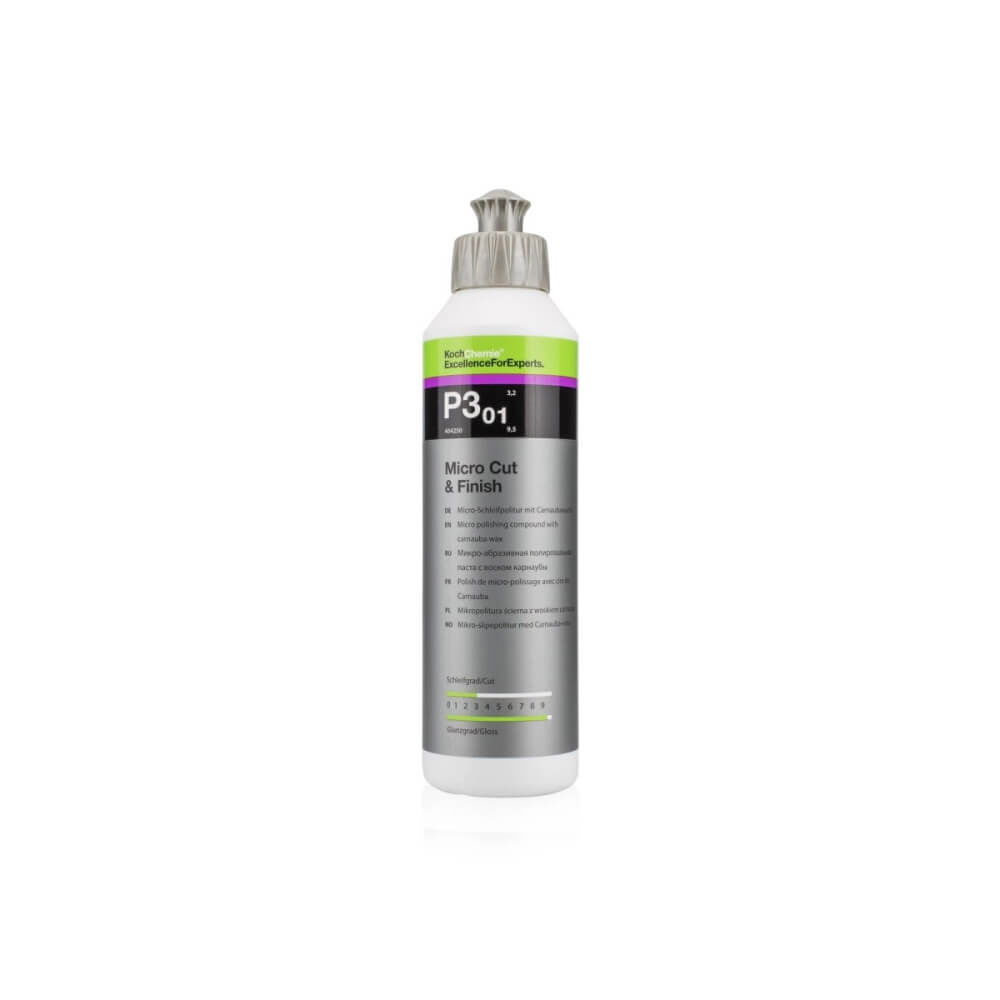 Koch Chemie P3.01 Micro Cut & Finish este ultima generație de micro polish (micro compound) pentru îndepărtarea permanentă a dungilor, a hologramelor, zgârieturilor fine, dungilor și a urmelor de șlefuire cu granulație de până la 3.000 pe toate tipurile de vopsea (inclusiv rezistente la zgârieturi), cu protecție (etanșare) simultană pe termen lung, cu un grad ridicat de luciu și netezime. P3.01Micro Cut & Finish conține compuși abrazivi extrem de omogeni, care creează un luciu strălucitor permanent în condiții de lumină extremă chiar și pe culori închise și în nuanțe sensibile. Hologramele și zgârieturile fine sunt eliminate mecanic și nu acoperite, ca în majoritatea cazurilor. Micro Cut & Finish este extrem de economic, ușor de lustruit (polisat) și ușor de înlăturat. Conține ceară Carnauba și siliconi non-fugitivi.